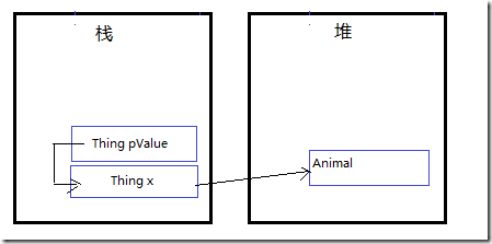 2、在棧上創建類型為Thing的x變量指向Animal實例的引用地址。