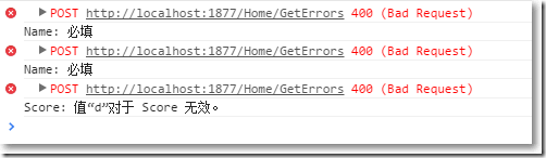 public class HomeController : Controller {public ActionResult Index(){ return View(new Student());}[HttpPost]public ActionResult GetErrors(Student student){ if (ModelState.IsValid) {return Content("沒有錯誤信息~~"); } Response.StatusCode = 400; Response.TrySkipIisCustomErrors = true; var modelErrors = ModelState.AllModelStateErrors(); return Json(modelErrors);} }在Home/Index.cshtml視圖中,當點擊"提交"按鈕,在控制臺顯示驗證失敗信息。