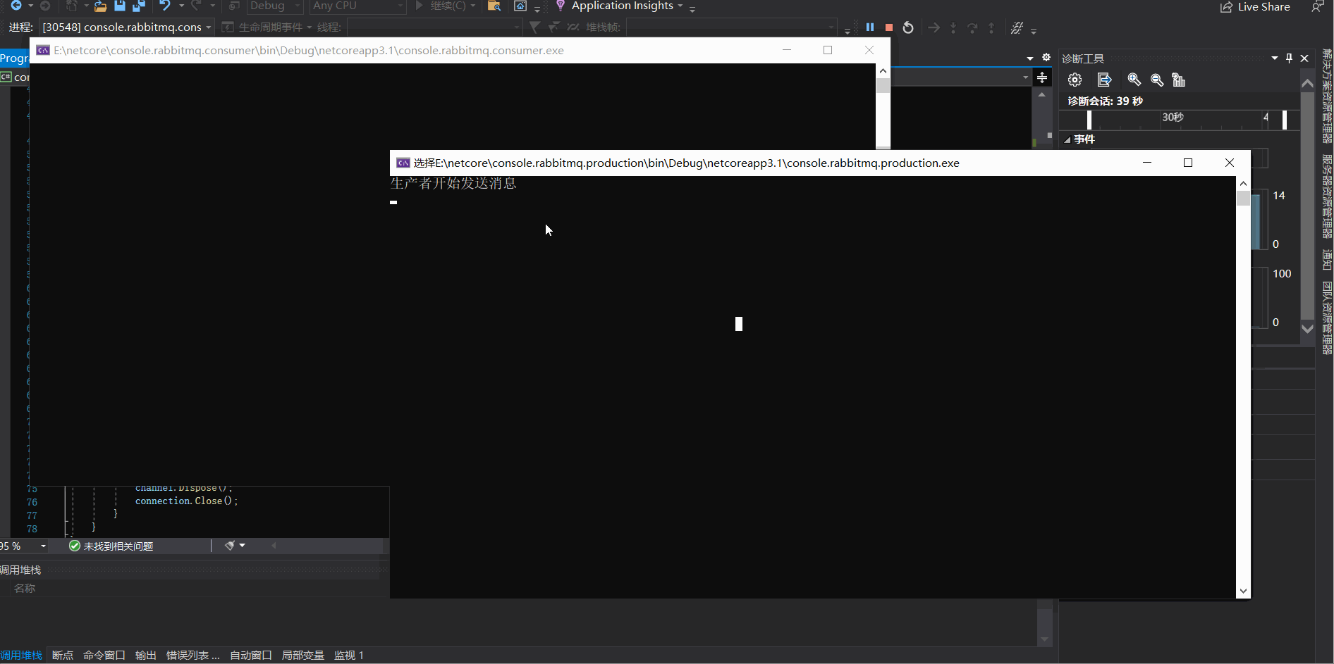 ConnectionFactory connectionFactory = new ConnectionFactory {UserName = "guest",Password = "guest",HostName = "127.0.0.1" }; //創建連接 var connection = connectionFactory.CreateConnection(); var channel = connection.CreateModel(); EventingBasicConsumer consumer = new EventingBasicConsumer(channel); //給消費時添加一個委托 consumer.Received += (obj, ea) => {var message = Encoding.UTF8.GetString(ea.Body.ToArray());//打印消費的消息Console.WriteLine(message);channel.BasicAck(ea.DeliveryTag, false); }; //消費queue.business.test隊列的消息 channel.BasicConsume("queue.business.test", false, consumer); Console.ReadKey(); channel.Dispose(); connection.Close();實現效果: