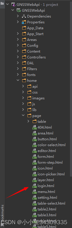 public class WebApiApplication : HttpApplication{ protected void Application_Start() {log4net.Config.XmlConfigurator.Configure(new FileInfo(Server.MapPath("~/Web.config")));AreaRegistration.RegisterAllAreas();GlobalConfiguration.Configure(WebApiConfig.Register);FilterConfig.RegisterGlobalFilters(GlobalFilters.Filters);RouteConfig.RegisterRoutes(RouteTable.Routes);BundleConfig.RegisterBundles(BundleTable.Bundles); } protected void Application_BeginRequest(object sender, EventArgs e) {if (Context.Request.FilePath == "/") Context.RewritePath("home/page/login.html"); }}靜態頁面的目錄結構如下所示: