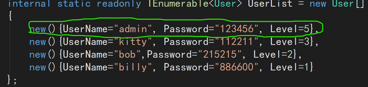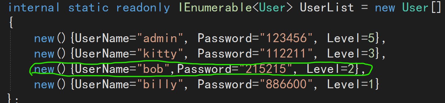 public static class UserDatas{ internal static readonly IEnumerable<User> UserList = new User[] {new(){UserName="admin", Password="123456", Level=5},new(){UserName="kitty", Password="112211", Level=3},new(){UserName="bob",Password="215215", Level=2},new(){UserName="billy", Password="886600", Level=1} }; // 獲取所有用戶 public static IEnumerable<User> GetUsers() => UserList; // 根據(jù)用戶名和密碼校對(duì)后返回的用戶實(shí)體 public static User? CheckUser(string username, string passwd) {return UserList.FirstOrDefault(u => u.UserName!.Equals(username, StringComparison.OrdinalIgnoreCase) && u.Password == passwd); }}這樣的功能,對(duì)于咱們今天要說(shuō)的內(nèi)容,已經(jīng)夠用了。