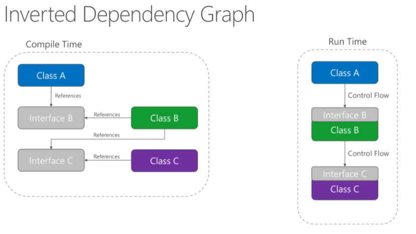 public class A{ //依賴接口 public IB b; public IC c; public A(IB _b, IC _c) {b = _b;c = _c; } public void Listen() {b.SayHi();c.SayBye(); }}public interface IB{ public void SayHi();}public interface IC{ public void SayBye();}DI依賴注入
