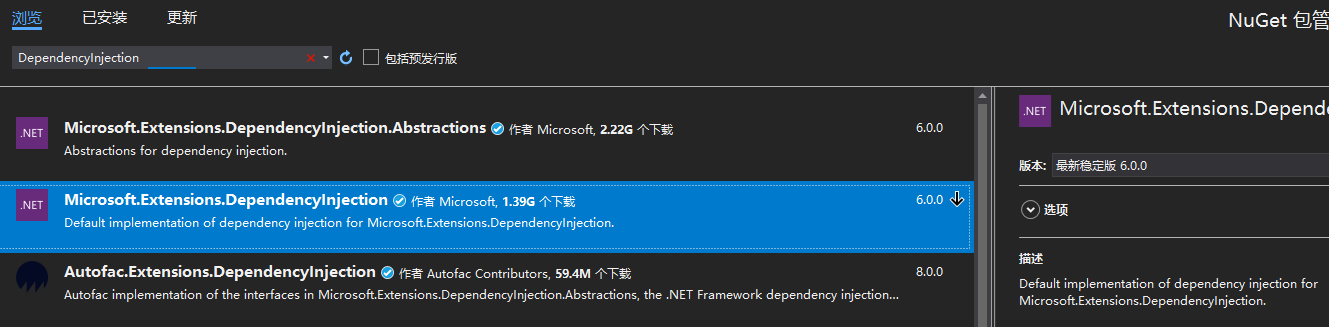 我們首先用代碼來看什么是DI,在.net提供的擴(kuò)展包Microsoft.Extensions.DependencyInjection中來完成DI,nuget安裝。
