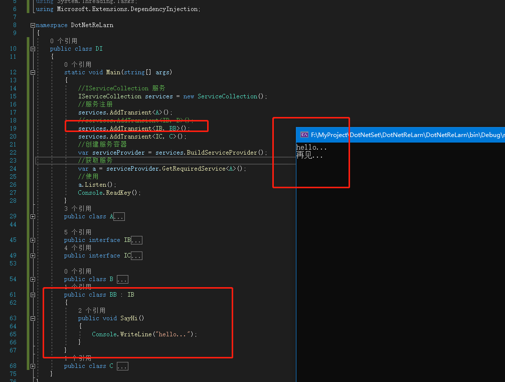 public class BB : IB{ public void SayHi() {Console.WriteLine("hello..."); }}替換注冊BB services.AddTransient<IB, BB>(),而不用去改任何邏輯。