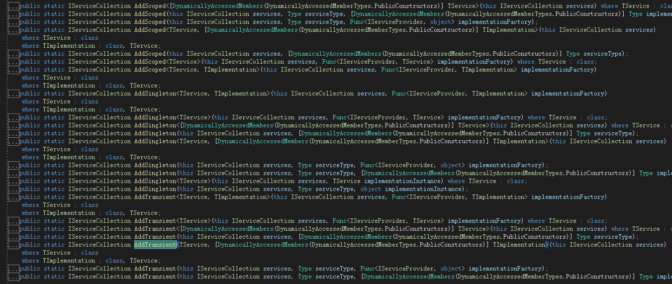 在注冊服務(wù)的時(shí)候我使用的AddTransient方法,表示注冊的服務(wù)是瞬態(tài)的,也就是每次請求都是重新創(chuàng)建實(shí)例。同時(shí)還提供其它注冊服務(wù)的方法。