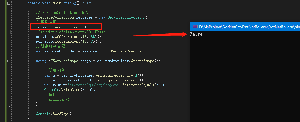 如果我們用AddTransient注冊A,即使在作用域內(nèi)兩個(gè)對象比較也是不一樣的,結(jié)果為False。