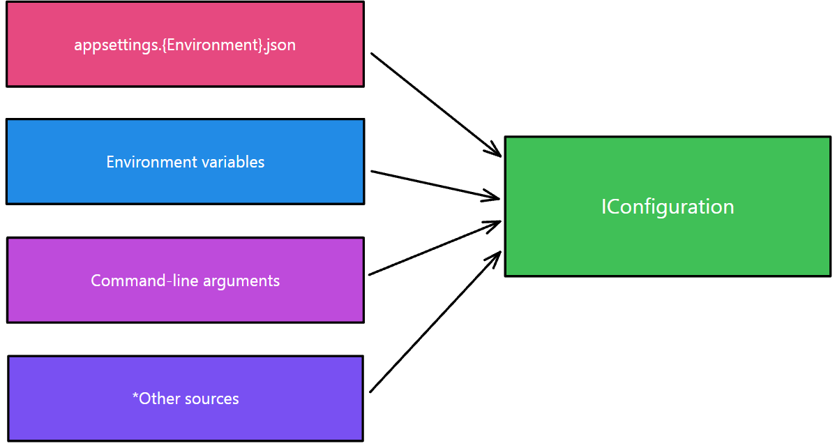 目前.NET 中的配置是使用一個或多個配置提供程序執行的。 配置提供程序使用各種配置源從鍵值對讀取配置數據,這些配置程序稍后我們會看到,讀取的配置源可以是如下這些: