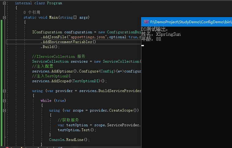 static void Main(string[] args){ IConfiguration configuration = new ConfigurationBuilder().AddJsonFile("appsettings.json",optional:true,reloadOnChange:true).Build(); //IServiceCollection 服務 ServiceCollection services = new ServiceCollection(); //注入配置 services.AddOptions().Configure<Config>(e=>configuration.Bind(e)); //注入TestOptionDI services.AddScoped<TestOptionDI>(); using (var provider = services.BuildServiceProvider()) {//獲取服務var testOption = provider.GetRequiredService<TestOptionDI>();testOption.Test(); } Console.ReadLine();}