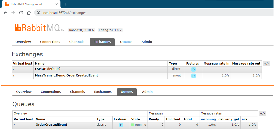 using MassTransit;using MassTransit.Demo;IHost host = Host.CreateDefaultBuilder(args) .ConfigureServices(services => {services.AddHostedService<Worker>();services.AddMassTransit(configurator =>{ configurator.AddConsumer<OrderCreatedEventConsumer>(); // configurator.UsingInMemory((context, cfg) => // { // cfg.ConfigureEndpoints(context); // }); configurator.UsingRabbitMq((context, cfg) => {cfg.Host( host: "localhost", port: 5672, virtualHost: "/", configure: hostConfig => {hostConfig.Username("guest");hostConfig.Password("guest"); });cfg.ConfigureEndpoints(context); });}); }) .Build();await host.RunAsync();運行項目,MassTransit會自動在指定的RabbitMQ上創建一個類型為fanout的MassTransit.Demo.OrderCreatedEventExchange和一個與OrderCreatedEvent同名的隊列進行消息傳輸,如下圖所示。