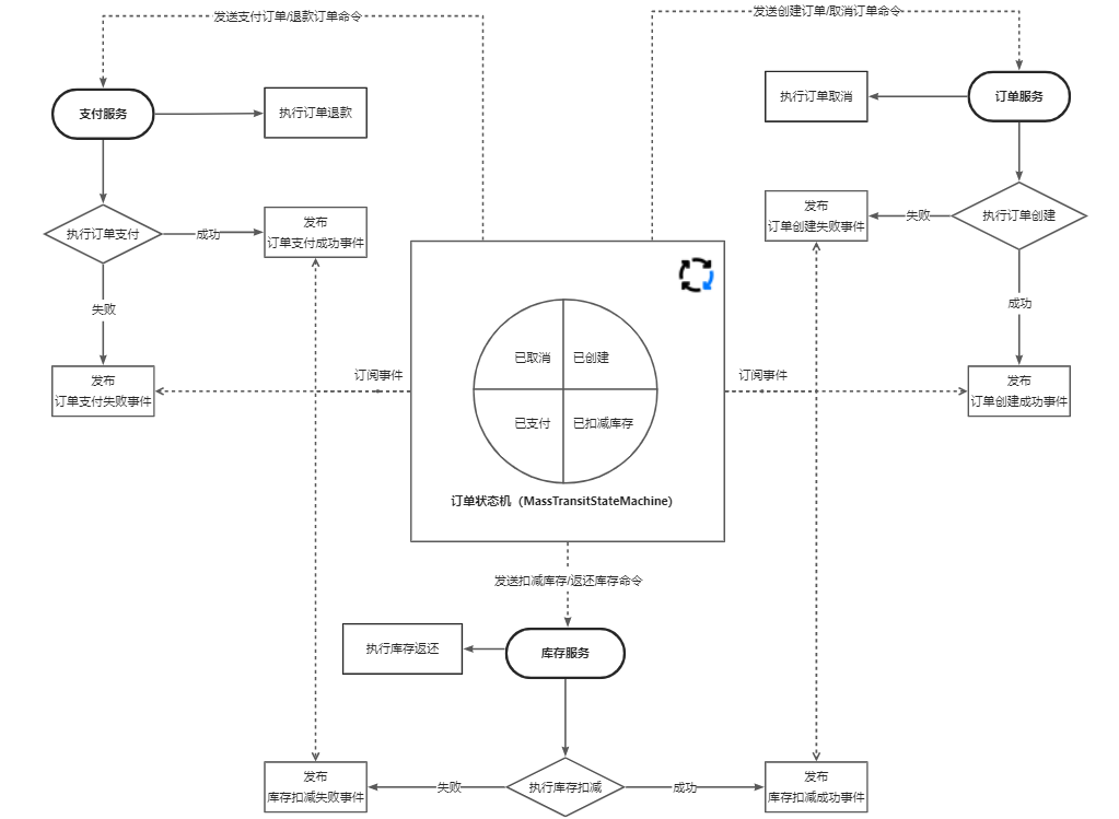 從上圖可知,通過MassTransitStateMachine可以將事件的執行順序邏輯編排在一個集中的狀態機中,通過發送命令和訂閱事件來推動狀態流轉,而這也正是Saga編排模式的實現。