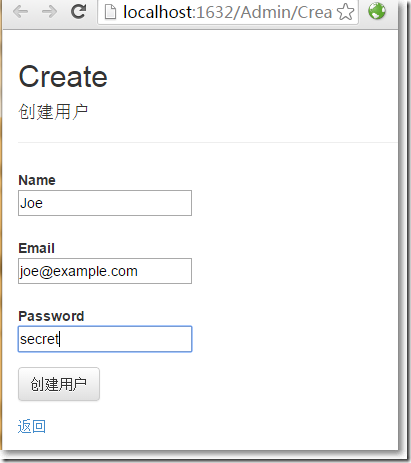 public class AdminController : Controller {public ActionResult Index(){ return View(UserManager.Users);}//創建顯示public ActionResult Create(){ return View();}[HttpPost]public async Task<ActionResult> Create(CreateModel model){ if(ModelState.IsValid) {var user = new AppUser{UserName = model.Name, Email = model.Email};IdentityResult result = await UserManager.CreateAsync(user, model.Password);if(result.Succeeded){ return RedirectToAction("Index");}else{ AddErrorsFromResult(result);} } return View(model);}//創建接收private void AddErrorsFromResult(IdentityResult result){ foreach(var error in result.Errors) {ModelState.AddModelError("", error); }}private AppUserManager UserManager{ get {return HttpContext.GetOwinContext().GetUserManager<AppUserManager>(); }} }在Admin/Create.cshtml視圖頁中: