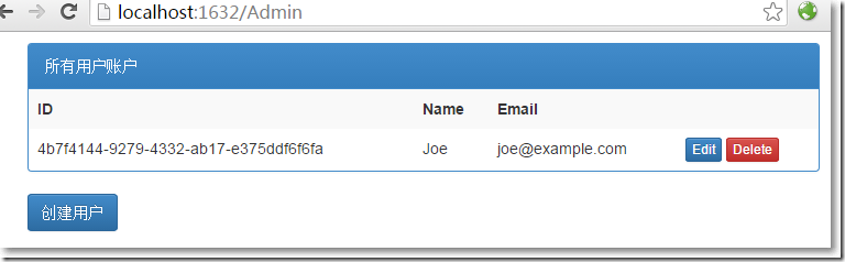 @model IEnumerable<string>@{ ViewBag.Title = "Error";}<div> @switch (Model.Count()) {case 0: @: Something went wrong. Please try again break;case 1:@Model.First(); break;default:@: 發現如下錯誤:<ul> @foreach (string error in Model) {<li>@error</li> }</ul> break; }</div>@Html.ActionLink("確定", "Index", null, new { @class = "btn btn-default" })至此,使用ASP.NET Identy實現對用戶的增刪改查完畢,ASP.NET Identity真的很好很強大!
