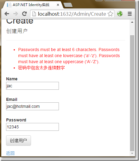namespace WebApplication4.Infrastructure{ public class AppUserManager : UserManager<AppUser> {public AppUserManager(IUserStore<AppUser> store) : base(store) { }public static AppUserManager Create(IdentityFactoryOptions<AppUserManager> options, IOwinContext context){ //identity ef上下文 AppIdentityDbContext db = context.Get<AppIdentityDbContext>(); //與identity ef相關的UserStore IUserStore<AppUser> us = new UserStore<AppUser>(db); AppUserManager manager = new AppUserManager(us); //密碼相關 manager.PasswordValidator = new CustomPasswordValidator { RequiredLength = 6,RequireNonLetterOrDigit = false,RequireDigit = false,RequireLowercase = true,RequireUppercase = true }; return manager;} }}再次運行程序,創建用戶頁面,嘗試輸入不通過的密碼。