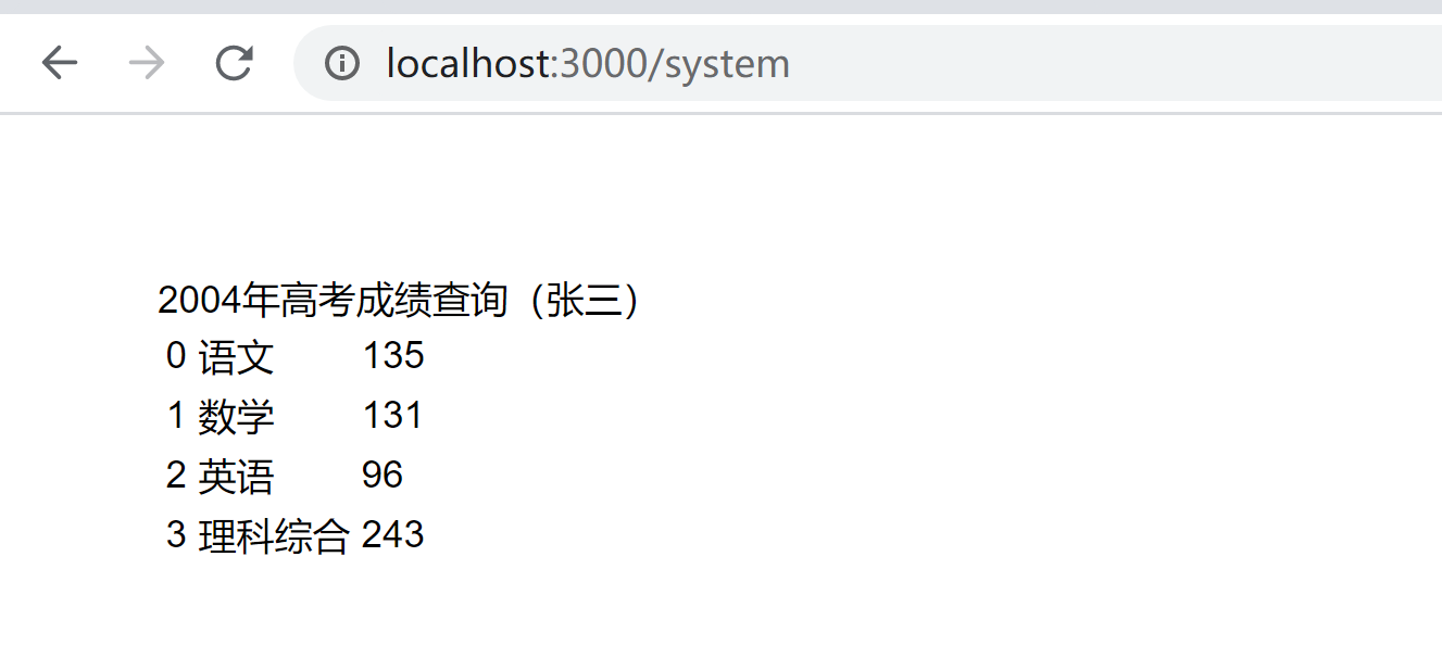 router.get("/", function(req, res, next) { //準備好的數據,真實的情形是從數據庫中得來的 var data = {year:2004,scores:[ {course:"語文",score: 135 }, {course:"數學",score:131 }, {course:"英語",score:96 }, {course:"理科綜合",score:243 }] }; //通過模板和數據渲染頁面 res.render("score", data);});4、就這么簡單,啟動服務,驗證