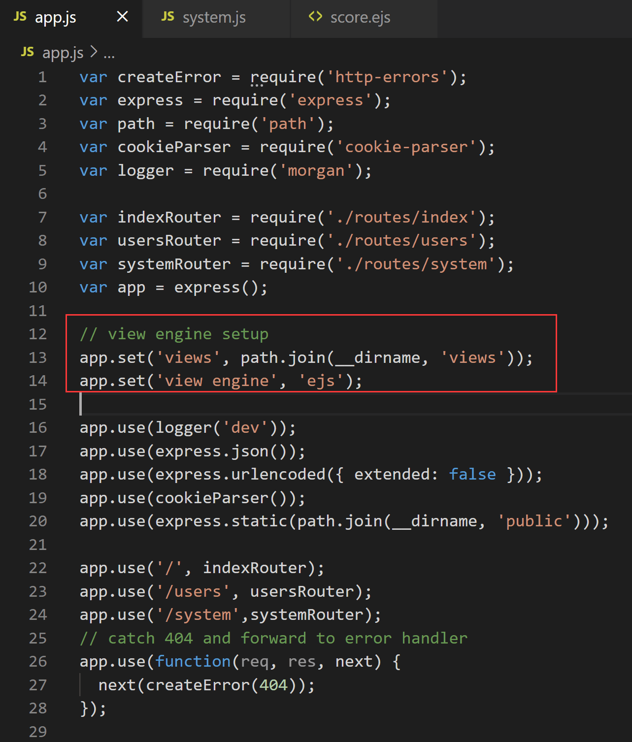 這兩句分別為我們指定了模板文件存放的路徑,和指定ejs為模板引擎。
