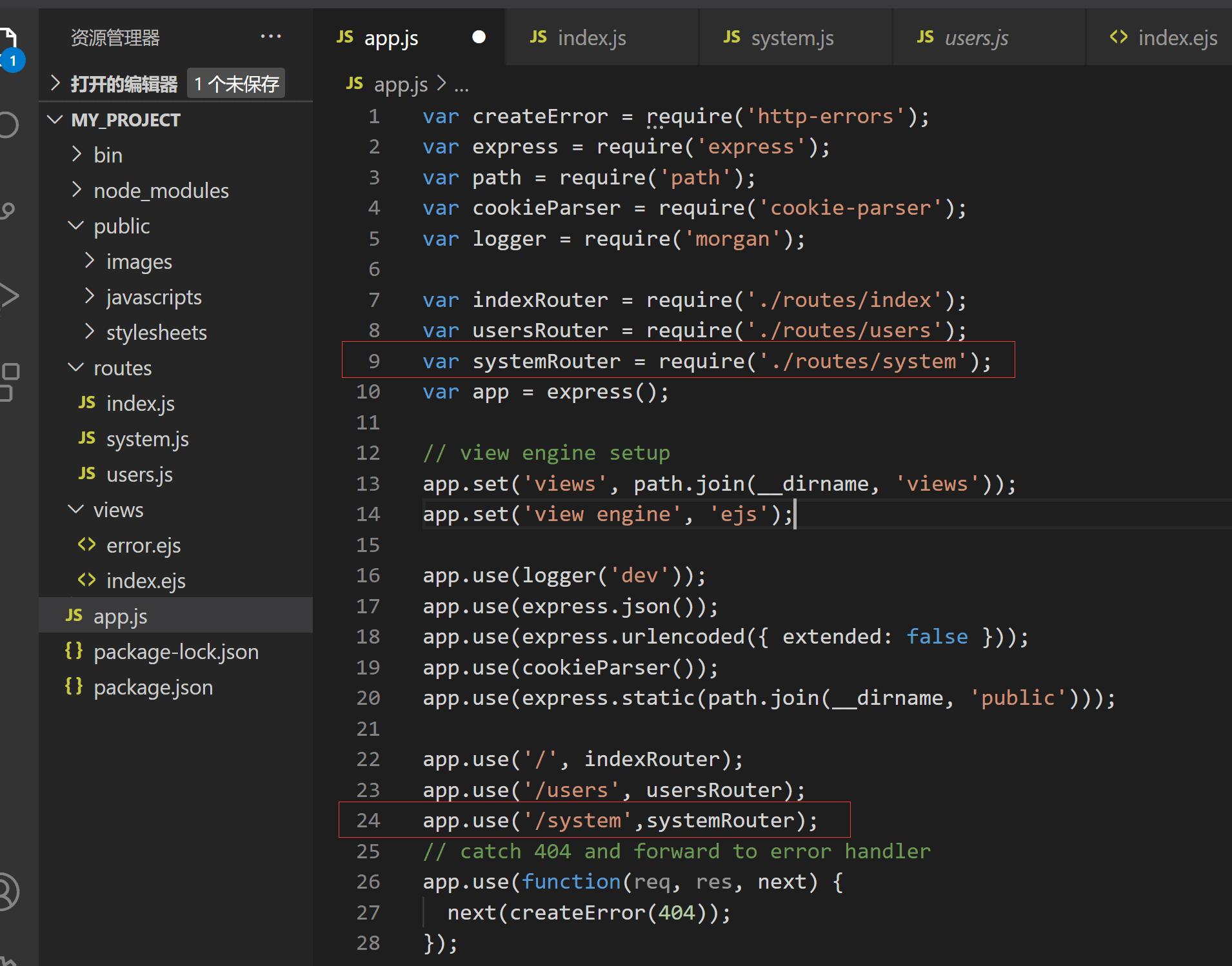 注:在app.js中第9行引入我們的system.js模塊,第24行,將這個模塊注冊在/system路徑上。