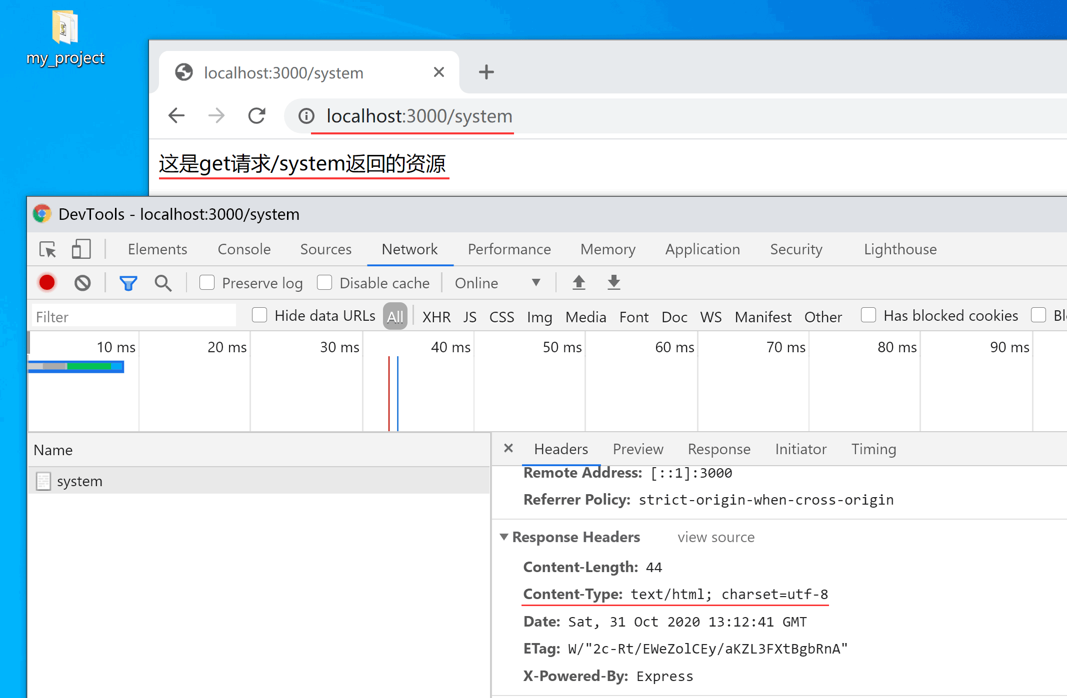 這里我們通過瀏覽器訪問/system,就可以執行到router.get后邊的方法,看看是否會得到預期的返回(是一段Html內容)。
