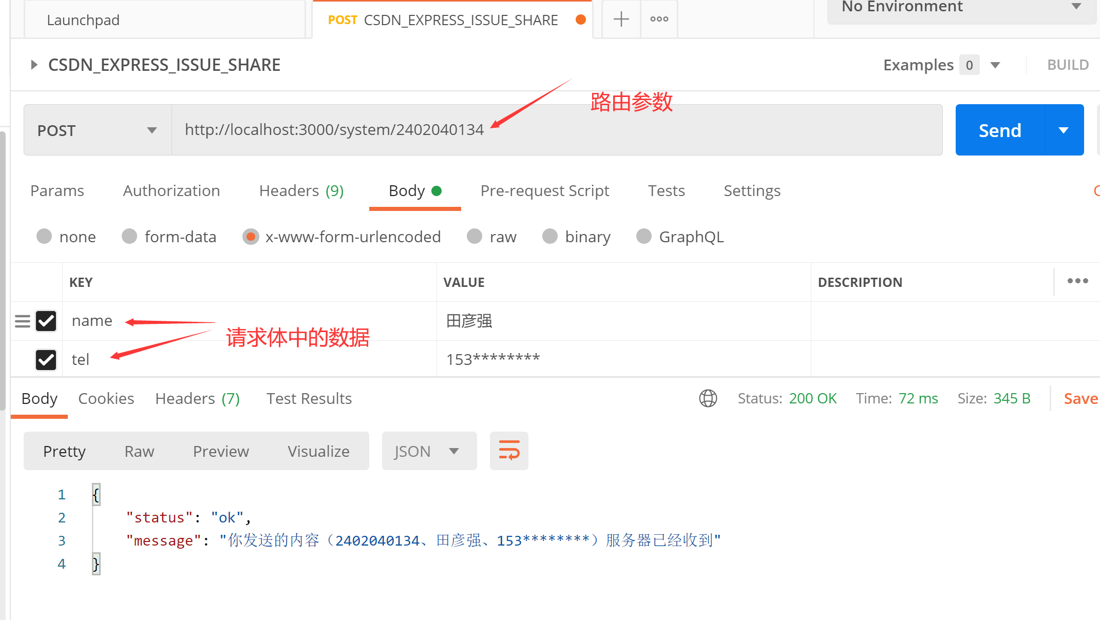 注意,在上圖中url中的2402040134即路由參數,下方的name和tel是post的請求body內容。最后,可以看到,返回了我們預期的json內容。