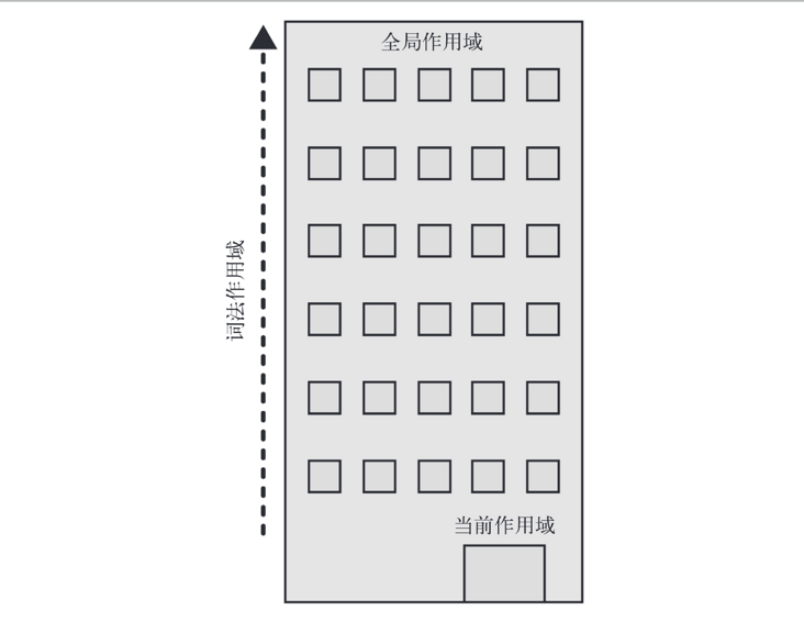 - 整個建筑代表程序中的嵌套作用域鏈,第一層樓代表當前的執行作用域,也就是你所處的位置。建筑的頂層代表全局作用域。