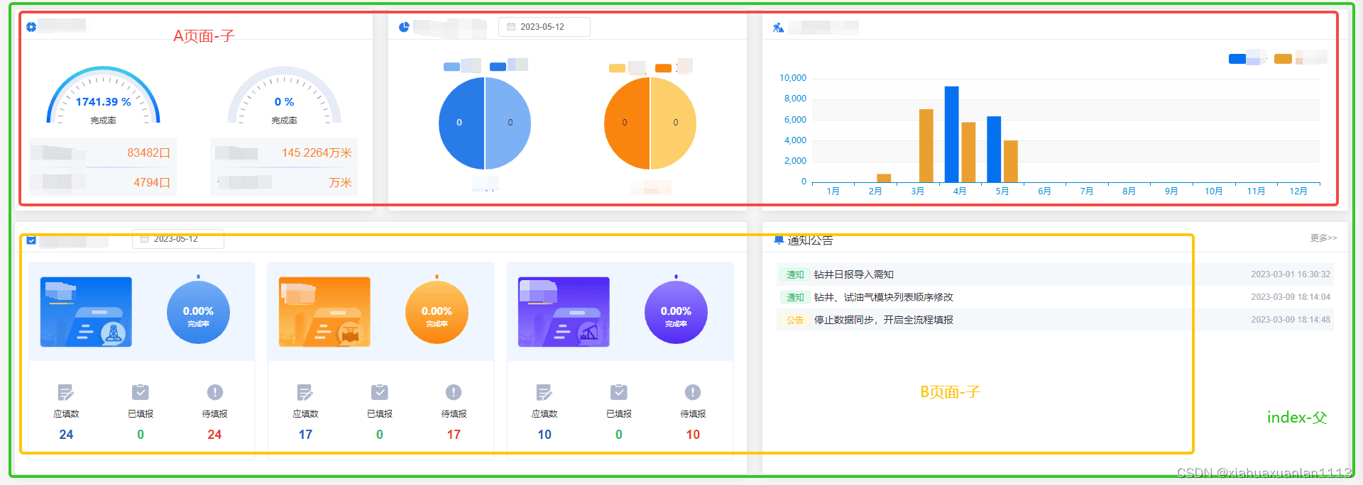 index頁面(綠框)是父頁面,父頁面中包含A頁面(紅框)和B頁面(橙框),A頁面中有3塊,共5個echarts圖,B頁面中有2部分,左側(cè)部分中有3個餅圖,右側(cè)部分是列表,綜上,index頁面共8個ecahrts圖。ps:A頁面和B頁面都是組件化書寫。