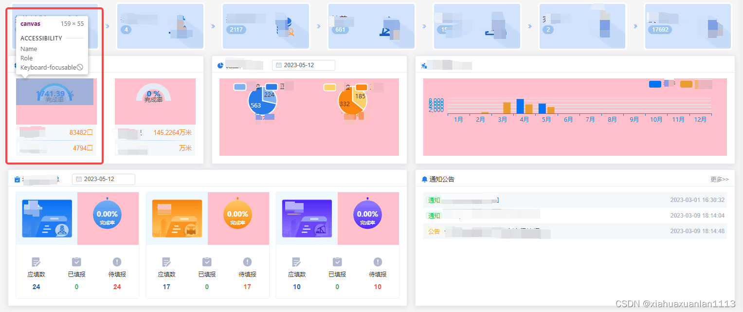 // 獲取容器的寬高let width = this.$refs.chart1.offsetWidthlet height= this.$refs.chart1.offsetHeight// 一般這一步是寫chart1.resize(),讓圖表根據(jù)當前屏幕尺寸自適應(yīng),但是當前canvas畫布大小與容器大小不一致,而容器大小已經(jīng)設(shè)置了百分比,所以可以在resize里面手動設(shè)置寬高,使其占滿整個容器chart1.resize({ // es6解構(gòu) width, height})每個圖表都設(shè)置,完成后效果如下: