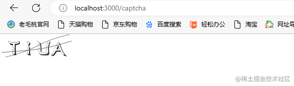 import { Controller, Get, Response, Session } from "@nestjs/common";import * as svgCaptcha from "svg-captcha";@Controller("captcha")export class CaptchaController { @Get() async getCaptcha(@Response() res, @Session() session) { const captcha = svgCaptcha.create({ size: 4, noise: 2, }); session.captcha = captcha.text; res.type("svg"); res.send(captcha.data); }}通過 session 將當前會話的 captcha 存起來此時能通過:http://localhost:3000/captcha查看到效果圖