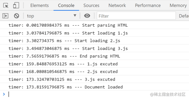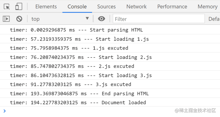 const text3 = ` // 超長文本`text3.split(" ");console.timeLog("timer", "--- 3.js excuted");我們分別使用普通、async和defer的方式加載1.js、2.js、3.js,觀察控制臺的打印結果:
