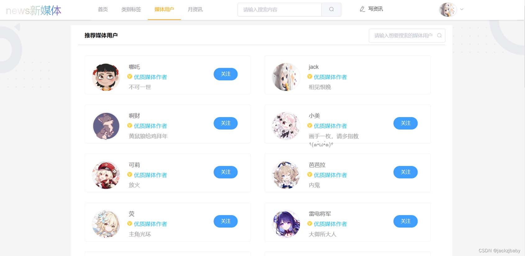 <template> <div> <div> <div><h3>推薦媒體用戶</h3><div> <el-input placeholder="請輸入想要搜索的媒體用戶" v-model="searchUser"> <i slot="suffix" @click="selUser" ></i> </el-input></div> </div> <div><div v-for="(item, index) in userData"> <div> <div> <img v-image-preview :src="item.avatar" /> </div> <div @click="personal(item.id)" > <div><span>{{ item.nickname }}</span> </div> <div v-if="item.v === 3"><img src="@/assets/img/V.png" /><span>優質媒體作者</span> </div> <div><span>{{ item.design }}</span> </div> </div> <div> <el-buttonv-if="$store.state.account !== item.account"@click="follow(item.id)"type="primary"size="medium"roundicon="el-icon-check"v-text="isfollowid.indexOf(item.id) > -1 ? "已關注" : "關注"" ></el-button> </div> </div></div> </div> </div> </div></template><script>export default { name: "AllUser", data() { return { isfollow: true,//是否關注 searchUser: "",//搜索框輸入 userData: [],//數據.....可先把下面的json數據放在這里看效果 }; }, mounted() { this.load(); }, methods: { load() {},//頁面數據加載 selUser() {},//搜索觸發事件 follow(id) {},//關注觸發事件 personal(id) { this.$router.push({ path: `/newsuser/personal/${id}` });//進入他人頁面 }, },};</script><style>.alluser { position: relative; margin-top: 20px; width: 70%; min-height: calc(100vh - 70px); left: 50%; transform: translateX(-50%); display: inline-block; background-color: white; padding: 20px;}.head { width: 100%; height: 35px; border-bottom: 3px solid #f0f0f0; display: flex; justify-content: space-between;}h3 { margin-left: 20px; line-height: 20px; font-size: 16px; font-weight: 600;}.headsearch { margin-top: -10px;}.user-card { display: flex; width: 100%; /* height: calc(100vh - 105px); */ flex-wrap: wrap;}.user-card :hover { border-width: 1px; border-color: deepskyblue;}.user-card-in { margin: 30px 20px auto 20px; height: 110px; width: 45%; border: 1px solid #f0f0f0; border-radius: 4px; -webkit-transition: 0.2s border-color; -o-transition: 0.2s border-color; transition: 0.2s border-color; /* display: flex; */}.user-card-one { display: flex;}.user-card-image { width: 100%; height: 100%; border-radius: 50%; border: 1px solid #ebebeb; vertical-align: top; margin: 20px; width: 80px; height: 80px; cursor: pointer;}.user-card-title { margin-left: 5px; margin-top: 25px; font-size: 10; line-height: 14px; cursor: pointer;}.user-card-title :hover { color: deepskyblue;}.user-card-name { color: #666; max-width: 180px;}.user-card-v { margin-top: 10px; margin-bottom: -15px;}.user-card-v-img { width: 15px; height: 15px;}.user-card-v-font { font-size: 16px; color: #00c3ff;}.user-card-sign { margin-left: 5px; margin-top: 20px; cursor: pointer;}.user-card-sign :hover { color: deepskyblue;}.user-card-signfont { line-height: 14px; color: #999; margin-top: 5px;}.user-card-button { margin-top: 35px; margin-left: 100px;}</style>JSON數據如下: