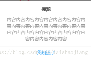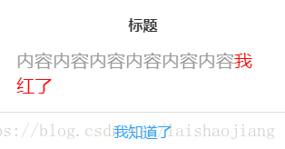 const html = `<div> 內(nèi)容內(nèi)容內(nèi)容內(nèi)容內(nèi)容內(nèi)容<span>我紅了</span></div> ` MessageBox ({ title: "標(biāo)題", message: html, confirmButtonText: "我知道了" })- 結(jié)果如下