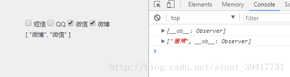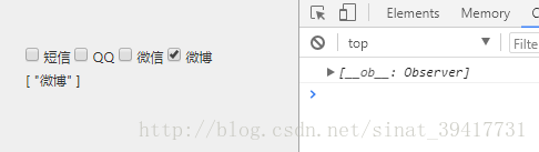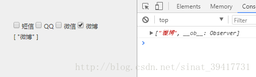 <template> <div class="mycheck" @click="check()"><input type="checkbox" v-model="value" value="短信" id="message"><label for="message" class="msg" ></label><label >短信</label> <input type="checkbox" v-model="value" value="QQ" ><label >QQ</label> <input type="checkbox" v-model="value" value="微信" ><label >微信</label> <input type="checkbox" v-model="value" value="微博"><label >微博</label> <p>{{value}}</p> </div></template><script>export default { data(){return { value:[]} }, methods:{check(){ console.log(this.value)} }</script> 當點擊微博 選項,控制臺輸出為一個空數(shù)組:
