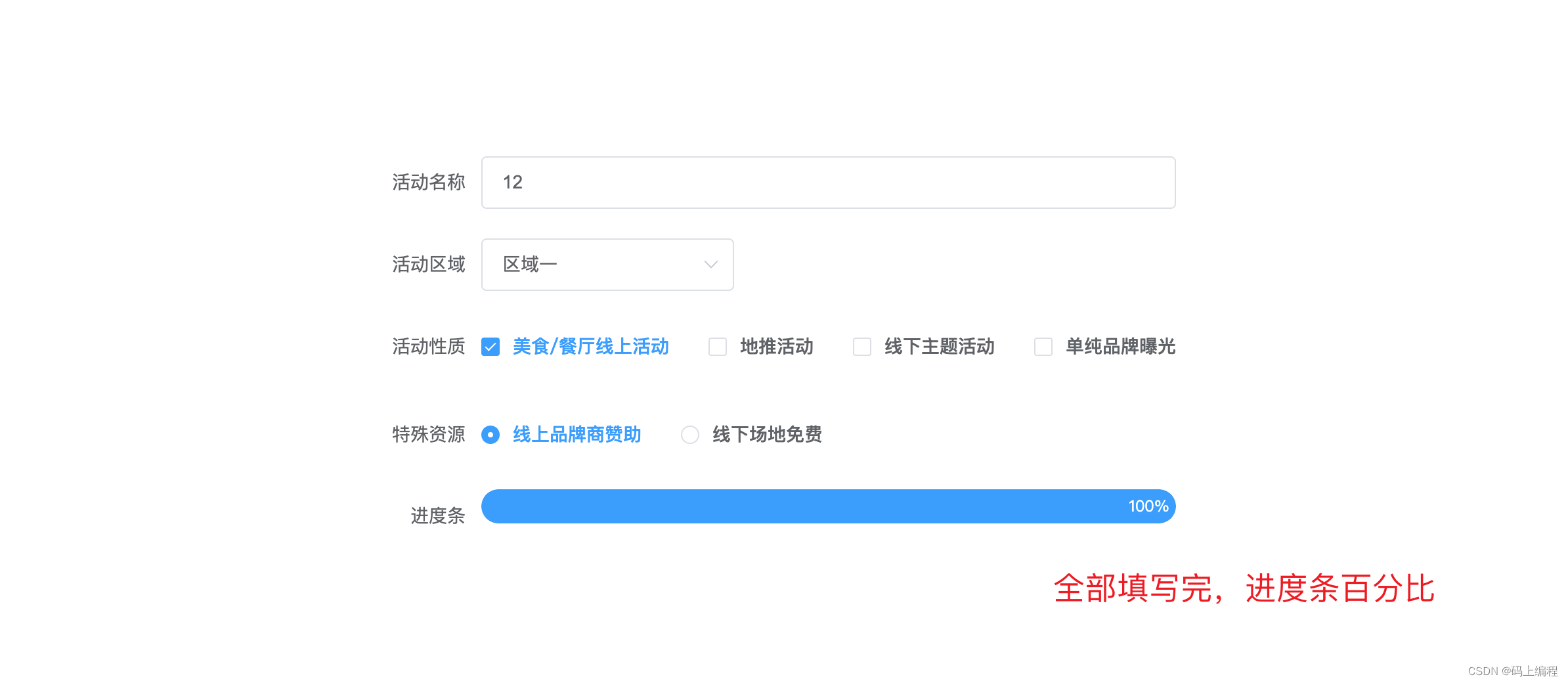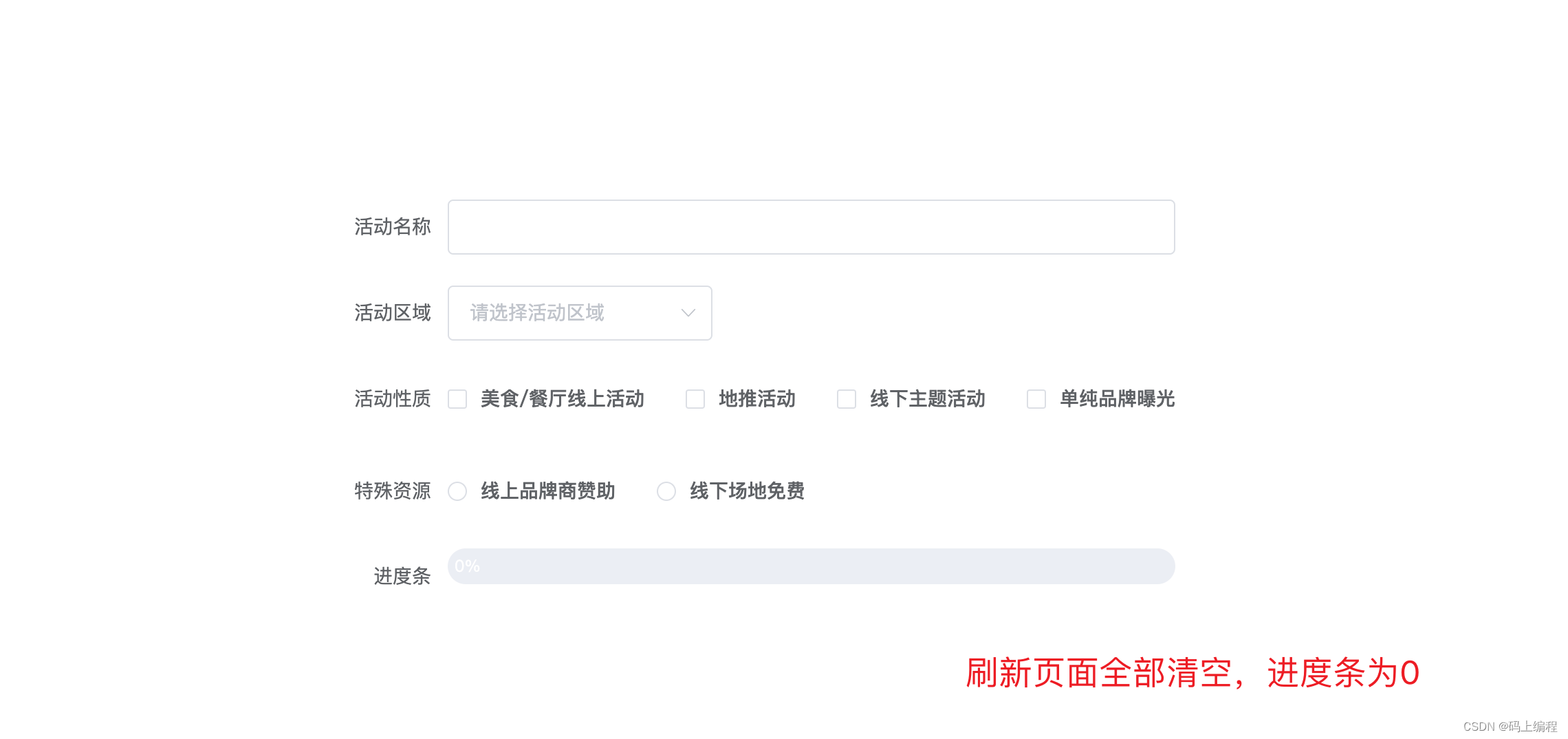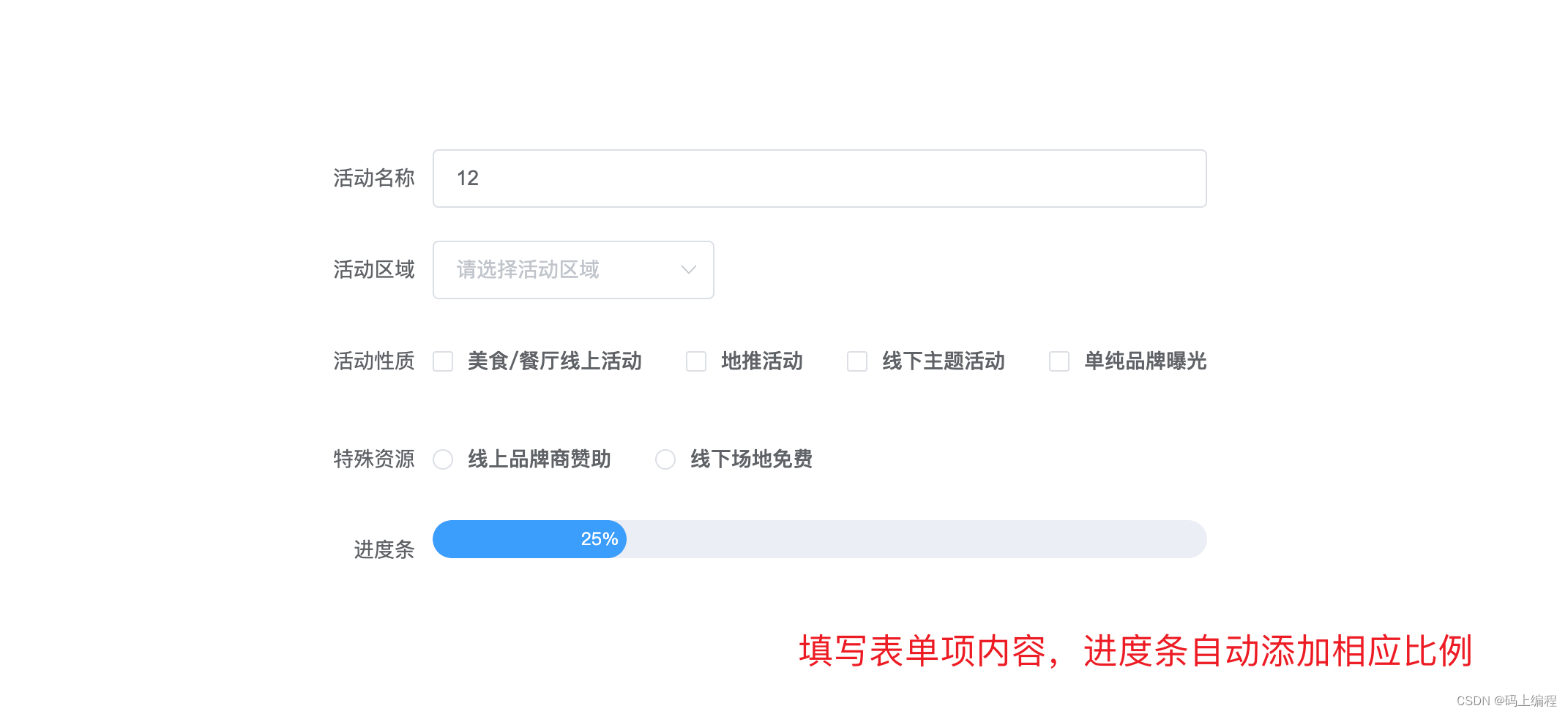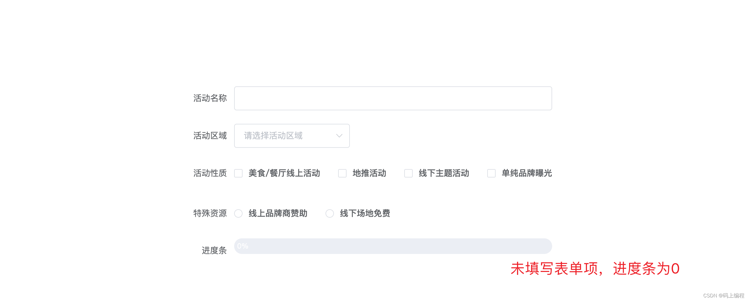 form: { // 存儲表單項的表單 name: "", region: "", type: [], resource: "",},calculateIntegrityForm: { // 存儲進度條比例的表單 name: 0, region: 0, type: 0, resource: 0,} // 監聽特殊資源變化 resourceChangeFn(val) { this.form.resource = val; this.updateProgress("resource", 25); }, // 監聽活動性質變化 typeChangeFn(val) { this.form.type = val; this.updateProgress("type", 25); }, // 監聽活動區域變化 regionChangeFn(val) { this.form.region = val; this.updateProgress("region", 25); }, // 監聽活動名稱變化 nameChangeFn(val) { this.form.name = val; this.updateProgress("name", 25); }, // 監聽進度條變化 updateProgress(key, num) { let sum = 0; if (this.isEmpty(this.form[key])) {// 監聽的元素為空this.calculateIntegrityForm[key] = 0; } else {// 監聽的元素不為空this.calculateIntegrityForm[key] = num; } for (let i in this.calculateIntegrityForm) {sum += this.calculateIntegrityForm[i]; } this.percentage = sum; },2、如何判斷對象、數組、字符串為空