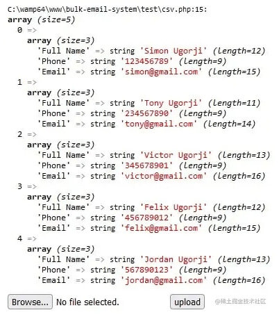 if($_FILES){ //loop through the csv file into an array $theCSV = array_map("str_getcsv", file($_FILES["file"]["tmp_name"], FILE_IGNORE_NEW_LINES | FILE_SKIP_EMPTY_LINES)); /*Walk through the array and combine the headers which is the first element of our csv array with the rest of the csv data*/ array_walk($theCSV, function(&$ary) use($theCSV) {$ary = array_combine($theCSV[0], $ary); }); //remove column headers which is the first element array_shift($theCSV); //dump result var_dump($theCSV);}這就是我們最終的 CSV 數組的樣子