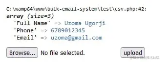 if($_FILES){ //loop through the csv file into an array $theCSV = array_map("str_getcsv", file($_FILES["file"]["tmp_name"], FILE_IGNORE_NEW_LINES | FILE_SKIP_EMPTY_LINES)); /*Walk through the array and combine the headers which is the first element of our csv array with the rest of the csv data*/ array_walk($theCSV, function(&$ary) use($theCSV) {$ary = array_combine($theCSV[0], $ary); }); //dump result var_dump($theCSV);}?>注意,在上面的回調函數中,我使用了變量& 運算符將 $ary 通過引用傳遞給函數,這使的我們可以修改原始數組。當我們運行上面的代碼時,這就是我們的 CSV 數組現在的樣子: