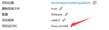 { "Logging": { "LogLevel": { "Default": "Information", "Microsoft.AspNetCore": "Warning" } }, "AllowedHosts": "*", "Kestrel": { "Endpoints": { "Http": {"Url": "http://*:86" } } }}9、正常發(fā)布,目標運行時選:linux-arm64。