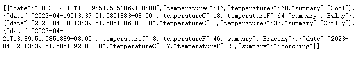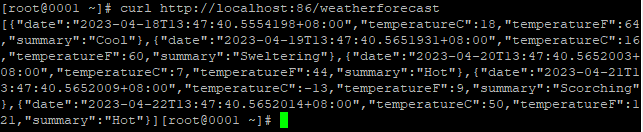 12、用瀏覽器訪問http://xx.xx.xx.xx:86/WeatherForecast,能正常返回接口數(shù)據(jù)且每次刷新頁面數(shù)據(jù)會隨機變動說明發(fā)布成功。