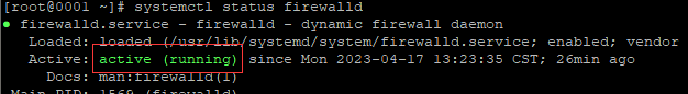 查看狀態(tài):systemctl status firewalld 查看防火墻狀態(tài) ,顯示active(running)說明防火墻已開啟。