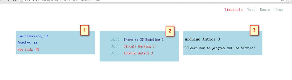 $("header a").on("click",function(e){ e.preventDefault(); //阻止事件默認行為 var href = this.href; //記錄要加載頁面的鏈接 //更新當前連接狀態 $("header a").removeClass("current"); $(this).addClass("current"); var $content = $("#content"); var $container = $("#container"); $container.remove(); $content.load(href + " #container"); //加載頁面id = container的內容 }); var times; //times用來存儲所有活動的環節時間表 $.ajax({ type:"get", //指定get方式 url:"example.json", async:true, beforeSend: function(jqXHR){ //在瀏覽器請求JSON數據之前,腳本會檢查瀏覽器是否支持overrideMineType()方法。 //該方法會用來告知服務器應當返回JSON數據。 //當服務器意外配置成返回其他格式的數據時,就可以使用這個方法了 if(jqXHR.overrideMimeType){ jqXHR.overrideMimeType("application/json"); } } }); function loadTimeTable(){//加載example.json文件中加載時間表的數據 $.getJSON( "example.json" ).done(function(data){ //加載成功,值被保存到times中 //console.log(data); times = data; }).fail(function(){ //加載失敗 $("#event").html("Sorry!we could not load the timetable at the moment"); }); } loadTimeTable(); //調用函數 //點擊活動名稱,將該活動的時間加載到中欄 $("#content").on("click","#event a",function(e){ e.preventDefault(); var loc = this.id.toUpperCase(); //保存活動位置的名稱 var newContent = ""; //設置展示樣式排版 for(var i = 0; i < times[loc].length; i++){ //alert(times[loc][i].time); newContent += "<li><span>" +times[loc][i].time +"</span>"; newContent += "<a href="descriptions.html#" rel="external nofollow" title="" +times[loc][i].title.replace(/ /g,"-")+ "">"; newContent += times[loc][i].title + "</a></li>"; } $("#sessions").html("<ul>"+newContent+"</ul>"); $("#event a").removeClass("current"); //更新活動鏈接的class屬性,借此凸顯當前活動 $(this).addClass("current"); $("#details").text(""); //如果第三欄中包含內容,就清空它 }); //點擊中欄中的環節是產生相應,它會加載環節的描述信息 $("#content").on("click","#sessions a",function(e){ e.preventDefault(); var fragment = this.href.replace("#"," #"); //更新當前連接狀態 $("#details a").removeClass("current"); $(this).addClass("current"); $("#details").load(fragment+this.title); //查找到descriptions.html頁面中id對應的部分加載到當前頁面 });整個demo的地址