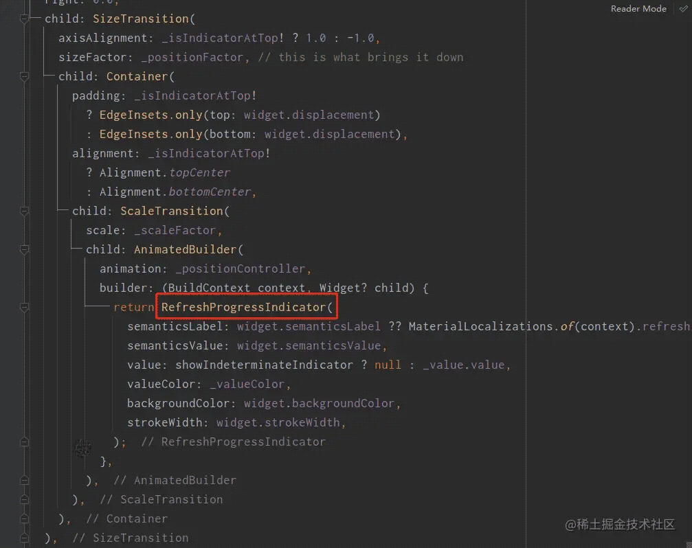 簡單的樣式修改,如想換成順時針旋轉的 iOS 風格活動指示器,只需替換對應樣式代碼即可。查看RefreshIndicator的源碼,代碼翻到最下面就可以看到其實是自定義了一個RefreshProgressIndicator樣式,通過繼承CircularProgressIndicator來實現初始樣式。