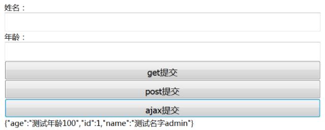 <form > 姓名:<input name="name" type="text"/> 年齡:<input name="age" type="text"/> <input type="button" value="get提交"/> <input type="button" value="post提交"/> <input type="button" value="ajax提交"/> </form> <div id="box"></div>