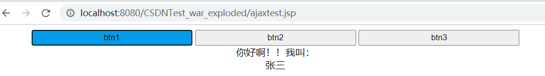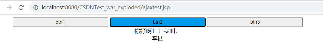 <%-- Created by IntelliJ IDEA. User: ASUS Date: 2021/3/2 Time: 22:20 To change this template use File | Settings | File Templates.--%><%@ page contentType="text/html;charset=UTF-8" language="java" %><html><head> <title>Title</title> <title>ajax局部刷新</title> <script type="text/javascript" src="<%=request.getContextPath()%>/js/jquery-1.11.0.js"></script> <style type="text/css"> input { width: 260px; height: 25px; } input:focus {//按鈕點(diǎn)擊后改變顏色 background: #10a0e9; } </style></head><body><input type="button" value="btn1" onclick="btnfun1()"><input type="button" value="btn2" onclick="btnfun2()"><input type="button" value="btn3" onclick="btnfun3()"><br><span>你好啊!!我叫:</span><div id="div1"></div></body><script type="text/javascript"> function btnfun1() { $.ajax({ url: "<%=request.getContextPath()%>/ajaxServlet", //上傳URL type: "POST", //請(qǐng)求方式 data: {"flag": "one"}, //需要上傳的數(shù)據(jù) dataType: "text", //設(shè)置接受到的響應(yīng)數(shù)據(jù)的格式 success: function (data) { //請(qǐng)求成功 console.log(data); $("#div1").html(data); }, error: function () { alert("出錯(cuò)啦..."); },//表示如果請(qǐng)求響應(yīng)出現(xiàn)錯(cuò)誤,會(huì)執(zhí)行的回調(diào)函數(shù) }); } function btnfun2() { $.ajax({ url: "<%=request.getContextPath()%>/ajaxServlet", //上傳URL type: "POST", //請(qǐng)求方式 data: {"flag": "two"}, //需要上傳的數(shù)據(jù) dataType: "text", //設(shè)置接受到的響應(yīng)數(shù)據(jù)的格式 success: function (data) { //請(qǐng)求成功 console.log(data); $("#div1").html(data); }, error: function () { alert("出錯(cuò)啦..."); },//表示如果請(qǐng)求響應(yīng)出現(xiàn)錯(cuò)誤,會(huì)執(zhí)行的回調(diào)函數(shù) }); } function btnfun3() { $.ajax({ url: "<%=request.getContextPath()%>/ajaxServlet", //上傳URL type: "POST", //請(qǐng)求方式 data: {"flag": "three"}, //需要上傳的數(shù)據(jù) dataType: "text", //設(shè)置接受到的響應(yīng)數(shù)據(jù)的格式 success: function (data) { //請(qǐng)求成功 console.log(data); $("#div1").html(data); }, error: function () { alert("出錯(cuò)啦..."); },//表示如果請(qǐng)求響應(yīng)出現(xiàn)錯(cuò)誤,會(huì)執(zhí)行的回調(diào)函數(shù) }); }</script></html>java代碼