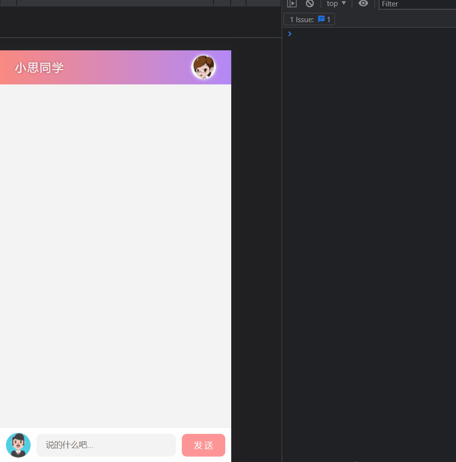 // 自己發的 const li = document.createElement("li") li.className = "right_word" document.querySelector("#talk_list").appendChild(li) li.innerHTML = `<img src="lib/img/person02.png" /> <span>${val}</span></li>` ipt.value="" // 滾動到頁面最下面 document.querySelector("ul").scrollTop = document.querySelector("ul").scrollHeight此時再進行校驗下: