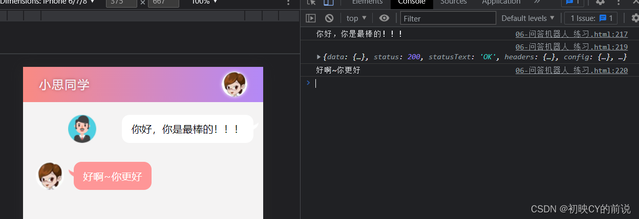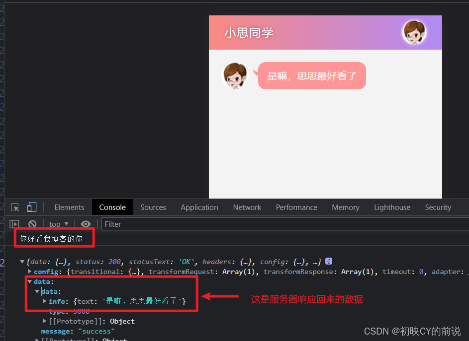 axios.get("http://ajax-api.itheima.net/api/robot",{ params: { spoken: val}}).then(res => {console.log(res);//res本質是服務器響應的值console.log(res.data.data.info.text);const words = res.data.data.info.text這是服務器響應數據返回的值所在的位置(res.data.data.info.text)