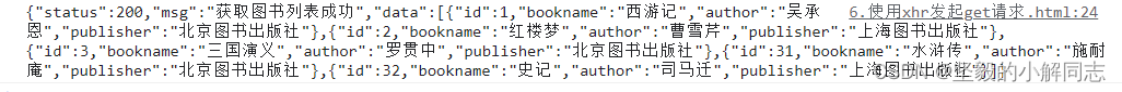//創建xhr對象let xhr = new XMLHttpRequest();//調用open函數xhr.open("get", "http://www.liulongbin.top:3006/api/getbooks")//調用send函數xhr.send()//監聽事件xhr.onreadystatechange = function () { if (xhr.readyState === 4 && xhr.status === 200) {//獲取成功console.log(xhr.responseText); }}