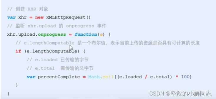xhr.onreadystatechange = function () {if (xhr.readyState === 4 && xhr.status === 200) { let data = JSON.parse(xhr.responseText) if (data.status === 200) {//上傳成功alert("上傳成功")document.getElementById("img").src = "http://www.liulongbin.top:3006" + data.url } else {console.log("圖片上傳失敗" + data.message); }} }顯示文件上傳進度
