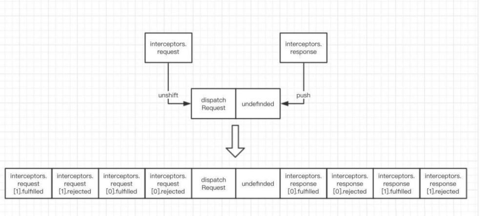 - 最核心的數組chain,這個數組中保存了請求攔截器、響應攔截器和發(fā)送請求函數。該數組中間放的是發(fā)送請求的函數,左邊放的是請求攔截器,右邊放的是響應攔截器。在第一步中返回的Promise對象,將遍歷chain數組逐一執(zhí)行里面的函數,并返回新的Promise對象