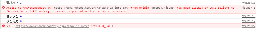 <html><head><title>AJAX實例</title><script language="javascript" type="text/javascript"> function ajaxHttpRequestFunc(){ let xmlHttpRequest; // 創建XMLHttpRequest對象,即一個用于保存異步調用對象的變量 if(window.ActiveXObject){ // IE瀏覽器的創建方式 xmlHttpRequest = new ActiveXObject("Microsoft.XMLHTTP");}else if(window.XMLHttpRequest){ // Netscape瀏覽器中的創建方式 xmlHttpRequest = new XMLHttpRequest();} xmlHttpRequest.onreadystatechange=function(){ // 設置響應http請求狀態變化的事件 console.log("請求過程", xmlHttpRequest.readyState); if(xmlHttpRequest.readyState == 4){ // 判斷異步調用是否成功,若成功開始局部更新數據 console.log("狀態碼為", xmlHttpRequest.status); if(xmlHttpRequest.status == 200) { console.log("異步調用返回的數據為:", xmlHttpRequest .responseText); document.getElementById("myDiv").innerHTML = xmlHttpRequest .responseText; // 局部刷新數據到頁面 } else { // 如果異步調用未成功,彈出警告框,并顯示錯誤狀態碼 alert("error:HTTP狀態碼為:"+xmlHttpRequest.status); } } } xmlHttpRequest.open("GET","https://www.runoob.com/try/ajax/ajax_info.txt",true); // 創建http請求,并指定請求得方法(get)、url(https://www.runoob.com/try/ajax/ajax_info.txt)以及驗證信息 xmlHttpRequest.send(null); // 發送請求 }</script></head><body> <div id="myDiv">原數據</div> <input type = "button" value = "更新數據" onclick = "ajaxHttpRequestFunc()"></body></html>直接運行該段代碼可能會出現跨域的現象,控制臺的報錯信息如下: