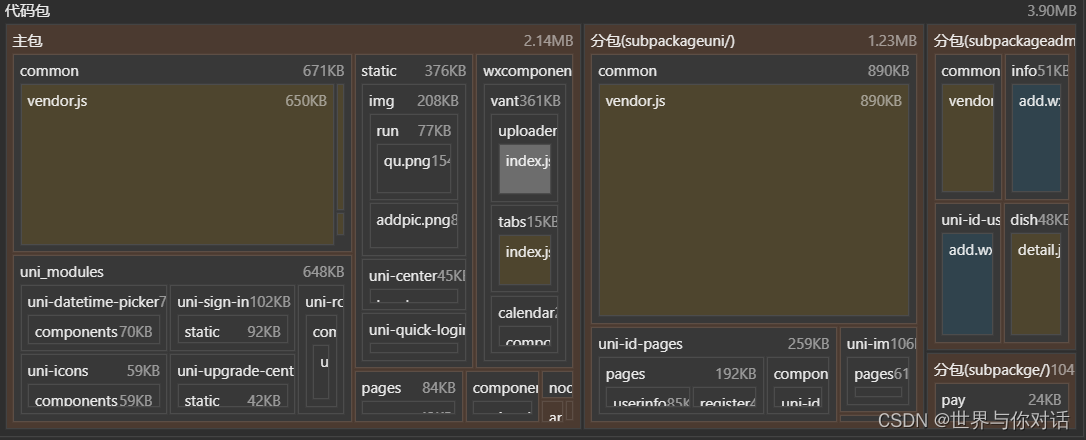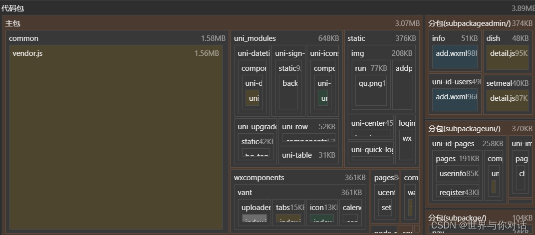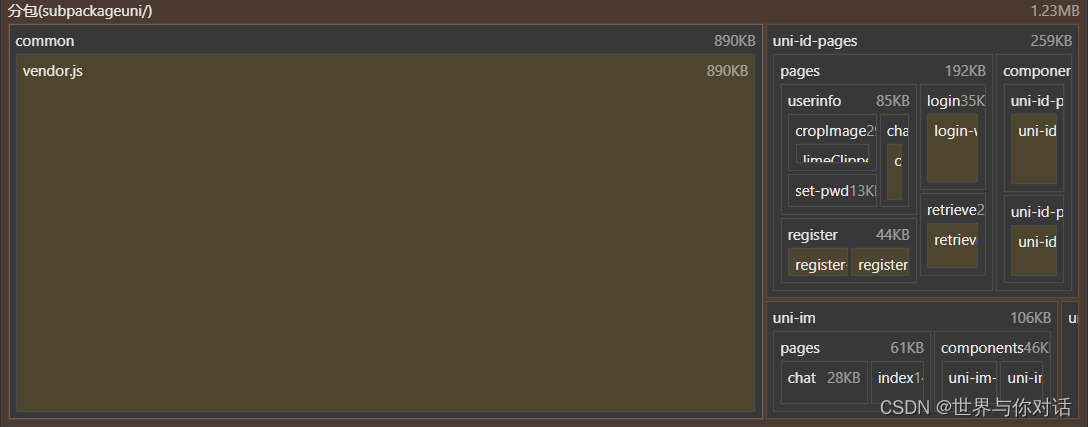 而由于把uni-id-pages和uni-im進(jìn)行了分包,分包中的vendor.js明顯變大(這樣就把以前位于主包的vendor.js打包到了分包中)