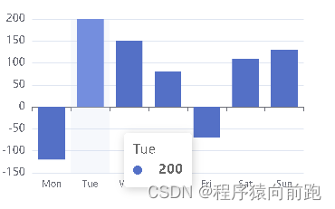 import * as echarts from "../../base-ui/ec-canvas/echarts";let chart = null;function initChart(canvas, width, height, dpr) { chart = echarts.init(canvas, null, { width: width, height: height, devicePixelRatio: dpr // new }); canvas.setChart(chart); var option = { tooltip: {trigger: "axis",axisPointer: { type: "shadow"} }, xAxis: {type: "category",data: ["Mon", "Tue", "Wed", "Thu", "Fri", "Sat", "Sun"],axisLabel:{ fontSize:10}, }, yAxis: {type: "value", }, series: [{ data: [-120, 200, 150, 80, -70, 110, 130], type: "bar"} ] }; chart.setOption(option); return chart;}Page({ onShareAppMessage: function (res) { return { title: "ECharts 可以在微信小程序中使用啦!", path: "/pages/index/index", success: function () { }, fail: function () { } } }, data: { ec: { onInit: initChart } }, onReady() { setTimeout(function () { // 獲取 chart 實例的方式 // console.log(chart) }, 2000); }});