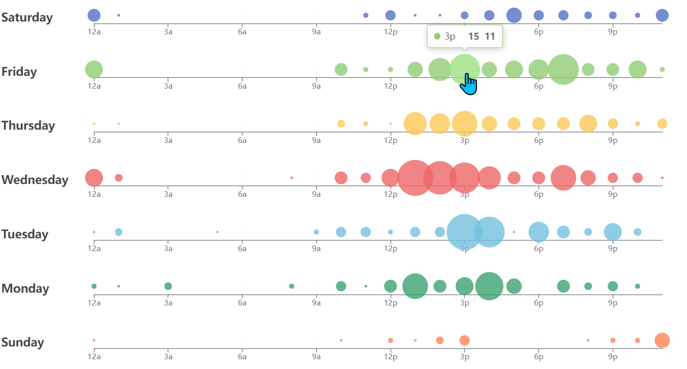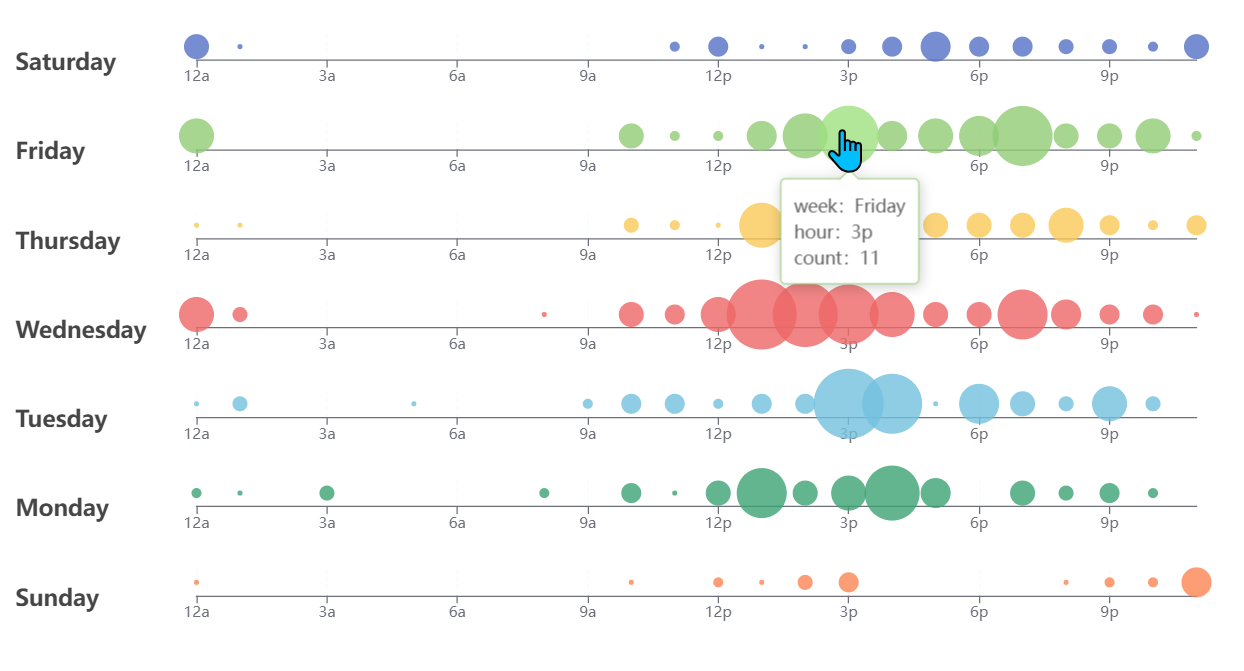//配置項const option = { title:[], dataset:[{ //使用 dimensions:["week","hours","count"], 方式時, //transform識別不到! source:[//原始數據集["week","hours","count"],[0, 0, 5], [0, 1, 1], [0, 2, 0], [0, 3, 0], [0, 4, 0], [0, 5, 0], [0, 6, 0], [0, 7, 0], [0, 8, 0], [0, 9, 0], [0, 10, 0], [0, 11, 2], [0, 12, 4], [0, 13, 1], [0, 14, 1], [0, 15, 3], [0, 16, 4], [0, 17, 6], [0, 18, 4], [0, 19, 4], [0, 20, 3], [0, 21, 3], [0, 22, 2], [0, 23, 5], [1, 0, 7], [1, 1, 0], [1, 2, 0], [1, 3, 0], [1, 4, 0], [1, 5, 0], [1, 6, 0], [1, 7, 0], [1, 8, 0], [1, 9, 0], [1, 10, 5], [1, 11, 2], [1, 12, 2], [1, 13, 6], [1, 14, 9], [1, 15, 11], [1, 16, 6], [1, 17, 7], [1, 18, 8], [1, 19, 12], [1, 20, 5], [1, 21, 5], [1, 22, 7], [1, 23, 2], [2, 0, 1], [2, 1, 1], [2, 2, 0], [2, 3, 0], [2, 4, 0], [2, 5, 0], [2, 6, 0], [2, 7, 0], [2, 8, 0], [2, 9, 0], [2, 10, 3], [2, 11, 2], [2, 12, 1], [2, 13, 9], [2, 14, 8], [2, 15, 10], [2, 16, 6], [2, 17, 5], [2, 18, 5], [2, 19, 5], [2, 20, 7], [2, 21, 4], [2, 22, 2], [2, 23, 4], [3, 0, 7], [3, 1, 3], [3, 2, 0], [3, 3, 0], [3, 4, 0], [3, 5, 0], [3, 6, 0], [3, 7, 0], [3, 8, 1], [3, 9, 0], [3, 10, 5], [3, 11, 4], [3, 12, 7], [3, 13, 14], [3, 14, 13], [3, 15, 12], [3, 16, 9], [3, 17, 5], [3, 18, 5], [3, 19, 10], [3, 20, 6], [3, 21, 4], [3, 22, 4], [3, 23, 1], [4, 0, 1], [4, 1, 3], [4, 2, 0], [4, 3, 0], [4, 4, 0], [4, 5, 1], [4, 6, 0], [4, 7, 0], [4, 8, 0], [4, 9, 2], [4, 10, 4], [4, 11, 4], [4, 12, 2], [4, 13, 4], [4, 14, 4], [4, 15, 14], [4, 16, 12], [4, 17, 1], [4, 18, 8], [4, 19, 5], [4, 20, 3], [4, 21, 7], [4, 22, 3], [4, 23, 0], [5, 0, 2], [5, 1, 1], [5, 2, 0], [5, 3, 3], [5, 4, 0], [5, 5, 0], [5, 6, 0], [5, 7, 0], [5, 8, 2], [5, 9, 0], [5, 10, 4], [5, 11, 1], [5, 12, 5], [5, 13, 10], [5, 14, 5], [5, 15, 7], [5, 16, 11], [5, 17, 6], [5, 18, 0], [5, 19, 5], [5, 20, 3], [5, 21, 4], [5, 22, 2], [5, 23, 0], [6, 0, 1], [6, 1, 0], [6, 2, 0], [6, 3, 0], [6, 4, 0], [6, 5, 0], [6, 6, 0], [6, 7, 0], [6, 8, 0], [6, 9, 0], [6, 10, 1], [6, 11, 0], [6, 12, 2], [6, 13, 1], [6, 14, 3], [6, 15, 4], [6, 16, 0], [6, 17, 0], [6, 18, 0], [6, 19, 0], [6, 20, 1], [6, 21, 2], [6, 22, 2], [6, 23, 6] ]}, ], tooltip: { formatter:param=>{return ` week:${week[param.value[0]]} <br/>hour:${hours[param.value[1]]} <br />count:${param.value[2]}` }, position: "bottom" }, singleAxis: [],//單軸配置 series: []}//24小時數組const hours = [ "12a", "1a", "2a", "3a", "4a", "5a", "6a", "7a", "8a", "9a", "10a", "11a", "12p", "1p", "2p", "3p", "4p", "5p", "6p", "7p", "8p", "9p", "10p", "11p"];//星期數組const week = ["Saturday", "Friday", "Thursday", "Wednesday", "Tuesday", "Monday", "Sunday"]for(let index = 0 ; index <7;index++){ option.title.push({ top: ((index + 0.5) * 100) / 7 + "%",//標題顯示位置 text: week[index]//標題} ) //通過transform從dataset.source中獲取目標數據 option.dataset.push({ transform: {type: "filter",//使用transform過濾器//條件:week維度值=index的值config: { dimension: "week", value: index }, }}, ); option.singleAxis.push({ left: 150, boundaryGap: false, //使用24小時數組為刻度 type: "category", data: hours, top: (index * 100) / 7 + 5 + "%", height: 100 / 7 - 10 + "%", axisLabel: {interval: 2, }} ); option.series.push({ datasetIndex: index + 1,//使用對應轉換好的數據源 singleAxisIndex: index, coordinateSystem: "singleAxis", type: "scatter", encode: {//數據的第2列和第三列為展示數據//transform數據源["hour","count"]無法識別single:[1,2] }, symbolSize: function (dataItem) {return dataItem[2] * 4; }} )}效果圖
