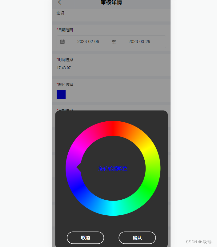 <template> <view> <view> <view id="colorBg" @touchstart="startTouch" @touchmove="moveIng" @touchend="endTouch"> <view :catchtouchmove="true" @c.stop="()=>{}" :style=""transform:rotate(" +degrees +"deg)""></view> <view :style=""color:"+getColorByDeg(this.degrees)">拖轉(zhuǎn)輪播取色</view> </view> <view> <button @click.stop = "close" type="default">取消</button> <button @click.stop = "readColor" type="default">確認</button> </view> </view> </view></template><script> export default { data() { return { pointerShow: true, colorPanWidth: 20, colorPanRadius: 0, pointerBox: {}, degrees: 0 } }, mounted() { uni.getSystemInfo({ success: (res) => { uni.createSelectorQuery().select("#colorBg").boundingClientRect((rect) => { this.pointerBox = rect }).exec() this.colorPanRadius = res.screenWidth * 0.4 } }) }, methods: { close(){this.$emit("close"); }, readColor(){ let colro = this.getColorByDeg(this.degrees); this.$emit("change",colro); }, rbg2Hex(r, g, b) {return "#" + ((1 << 24) + (r << 16) + (g << 8) + b).toString(16).slice(1); }, calculationScheme(deg) { deg = 360- deg + 120 const r = Math.round(Math.sin((deg * 2 * Math.PI) / 360) * 255) const g = Math.round(Math.sin(((deg + 120) * 2 * Math.PI) / 360) * 255) const b = Math.round(Math.sin(((deg + 240) * 2 * Math.PI) / 360) * 255) return this.colorRgbToHex(`rgb(${r},${g},${b})`); }, startTouch(e) { const { pageX, pageY } = e.touches[0] this.rotatePointer(pageX, pageY) }, endTouch(e) { const { pageX, pageY } = e.changedTouches[0] this.rotatePointer(pageX, pageY) }, moveIng(e) { const { pageX, pageY } = e.touches[0] this.rotatePointer(pageX, pageY) }, rotatePointer(pageX = 0, pageY = 0) { const { pointerBox, colorPanWidth } = this const mouseX = pageX - colorPanWidth const mouseY = pageY - colorPanWidth var centerY = pointerBox.top + (pointerBox.height / 2) - 0, centerX = pointerBox.left + (pointerBox.height / 2) - 0, radians = Math.atan2(mouseX - centerX, mouseY - centerY) this.degrees = (radians * (180 / Math.PI) * -1) + 180; }, getColorByDeg(deg) { deg = 360- deg + 120 const r = Math.round(Math.sin((deg * 2 * Math.PI) / 360) * 255) const g = Math.round(Math.sin(((deg + 120) * 2 * Math.PI) / 360) * 255) const b = Math.round(Math.sin(((deg + 240) * 2 * Math.PI) / 360) * 255) return `rgb(${r},${g},${b})` }, colorRgbToHex(rgbStr) { const reg = /^#([0-9a-fA-f]{3}|[0-9a-fA-f]{6}|[0-9a-fA-f]{8}|[0-9a-fA-f]{6}[0-9]{2})$/; if (reg.test(rgbStr)) { return rgbStr } else { const rgbArray = rgbStr.replace(/(?:\(|\)|rgba|rgb|RGBA|RGB)*/g, "").split(","); let strHex = "#"; for (let i = 0; i < rgbArray.length; i++) { if (i !== 3) { if (rgbArray[i] == "0") { strHex += "00" } else { let newItem =Number(rgbArray[i]).toString(16) if (newItem.length < 2){ newItem = "0" + newItem } strHex += newItem } } else { strHex += rgbArray[i] == "0" ? "" : Number(rgbArray[i]) * 100 } } return strHex; } } } }</script><style> .dialog { display: block; border-radius: 30rpx; background-color: #303030; margin: 20rpx; padding: 30rpx; } .flex { display: flex; justify-content: space-between; } .colorBg { width: 80vw; height: 80vw; margin: 5vw; background: conic-gradient(red, yellow, lime, aqua, blue, fuchsia, red); border-radius: 50%; position: relative; display: flex; justify-content: center; align-items: center; } .roundBuff { width: 55vw; height: 55vw; -webkit-transform-origin: center 50%; transform-origin: center 50%; background: #303030; border-radius: 50%; } .roundBuff::before { content: ""; width: 15px; height: 15px; background: #303030; border: solid #303030; border-width: 10px 10px 0 0; transform: translate(-50%, -50%) rotate(-45deg); position: absolute; left: 50%; top: 2%;} .lee_btn { background: #00000000; color: #FFFFFF; width: 36%; height: 80rpx; line-height: 70rpx; text-align: center; justify-content: center; font-size: 30rpx; border-radius: 50rpx; border: 5rpx #FFFFFF solid; font-weight: bold; padding: 1px 20px; } .colorPan { position: absolute; color: #FFFFFF; }</style>直接將整個組件復(fù)制過去 接口使用